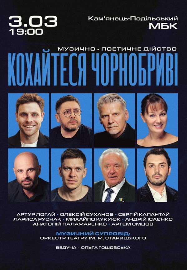 Це проєкт, у якому поезія знову стає подією — не сторінкою з підручника, а живим, сучасним і надзвичайно сильним переживанням. В основі програми — твори Тараса Шевченка, Лесі Українки, Василя Симоненка, Василя Стуса та інших визначних українських поетів, чия лірика торкається найглибших почуттів: любові, пристрасті, ніжності, внутрішньої сили та людської гідності. Їхні вірші звучать у виконанні відомих українських акторів театру і кіно у супроводі оркестру Театру ім. М. Старицького, створюючи єдине цілісне сценічне дійство, де слово, музика і світло працюють разом. “Кохайтеся, чорнобриві” — це: